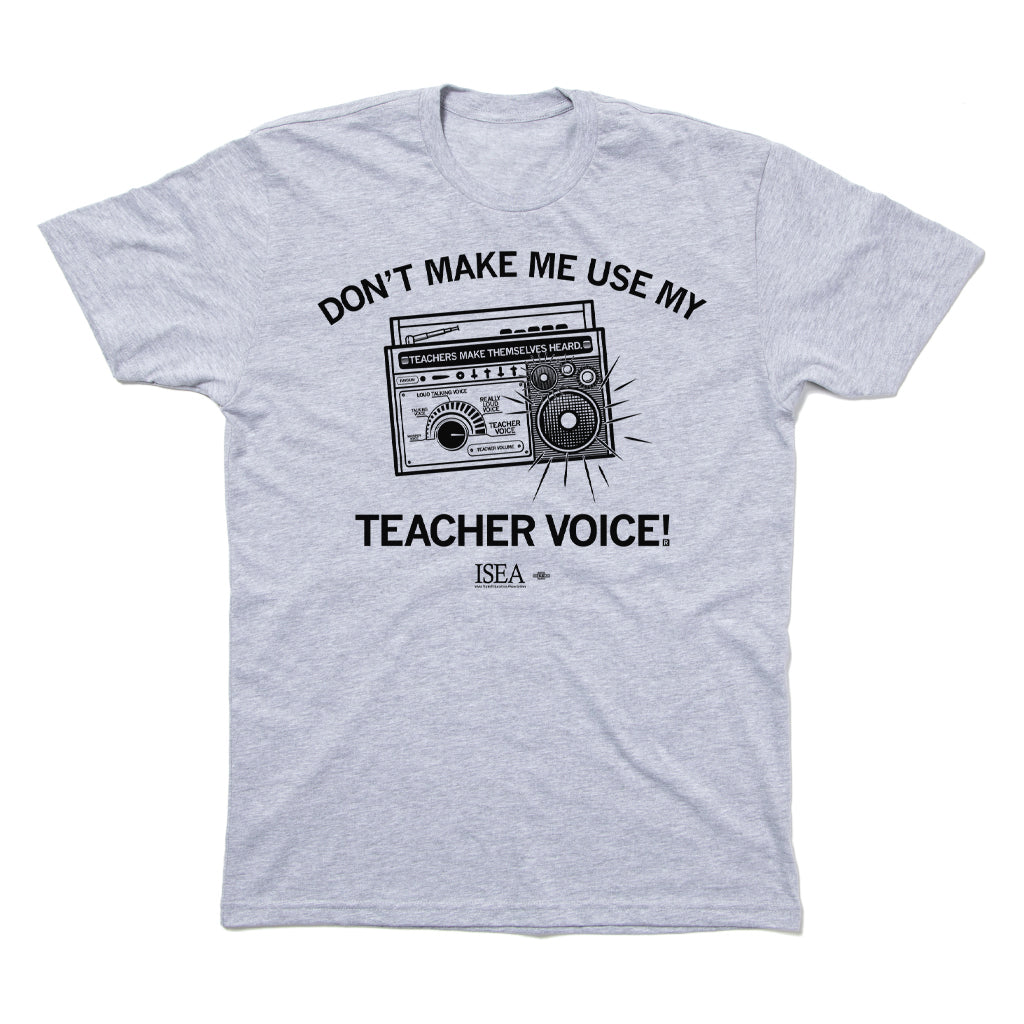 Don't Make Me Use My Teacher Voice. Black Ink on a Heather Grey T-shirt (90% Preshrunk Combed Cotton, 10% Polyester). Designed & Screen Printed by Union Labor at RAYGUN.