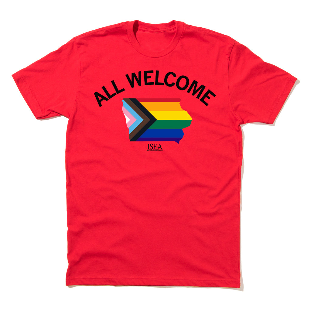 ISEA All Welcome on either a Red or Heather Grey T-shirt (100% Preshrunk Combed Cotton. Designed & Screen Printed by Union Labor at RAYGUN.