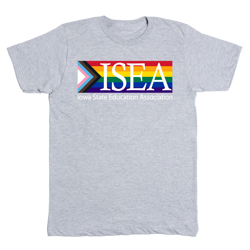 ISEA Pride Strip on either a Red or Heather Grey T-shirt (100% Preshrunk Combed Cotton. Designed & Screen Printed by Union Labor at RAYGUN.