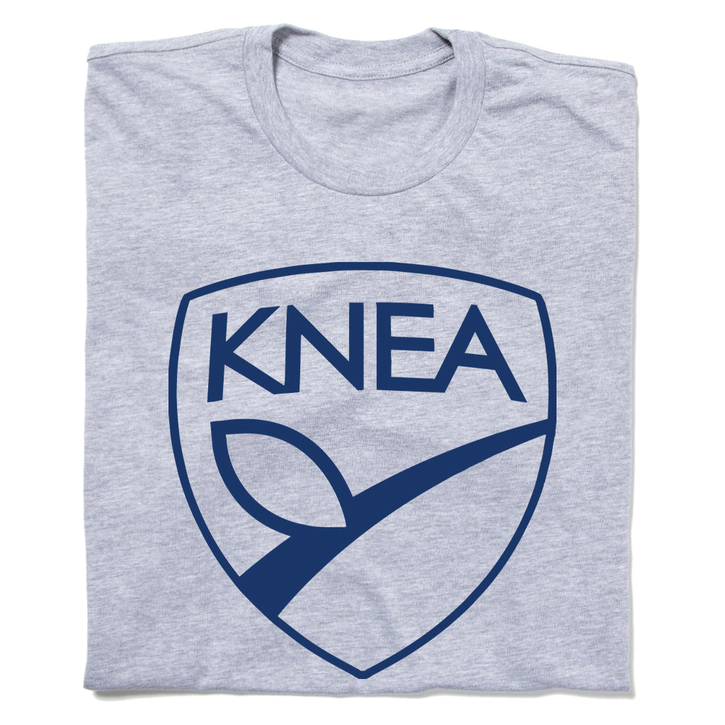 Navy on a Heather Grey T-shirt (90% Preshrunk Combed Cotton/ 10% Polyester).