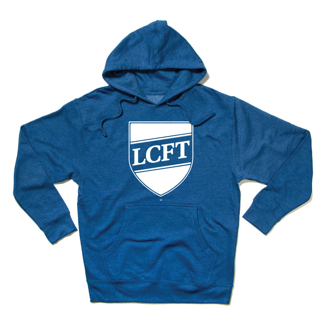 White Ink on a Heather Royal Hooded Sweatshirt (100% Preshrunk Combed Cotton).