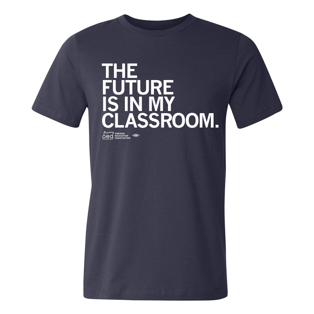 White Ink on a Navy T-shirt (100% Preshrunk Cotton).